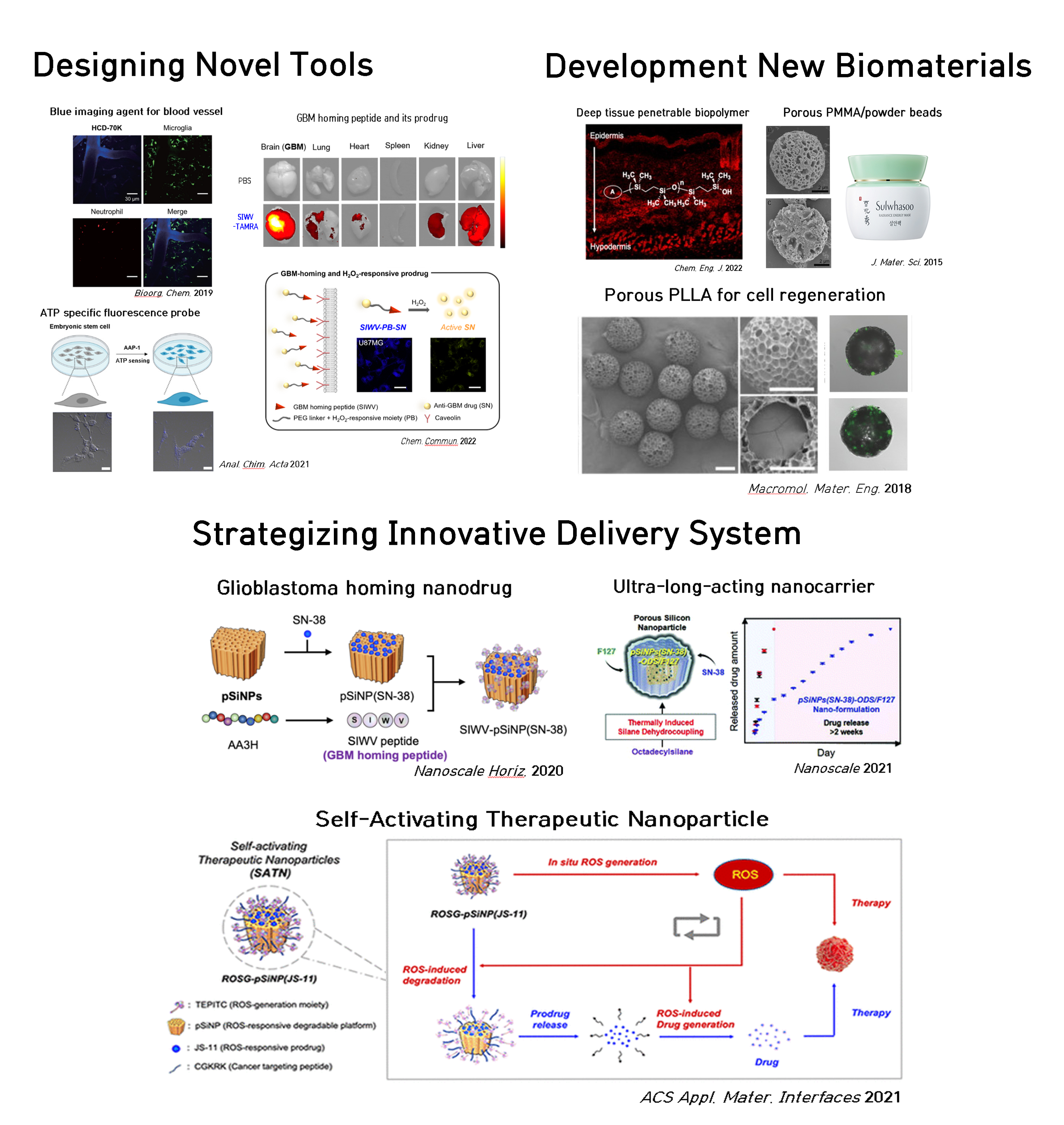 본 연구실은 재료화학과 약리학의 경계를 잇는 스마트 약물전달시스템(DDS)을 연구합니다. 다공성 실리콘(porous silicon) 나노입자와 고분자